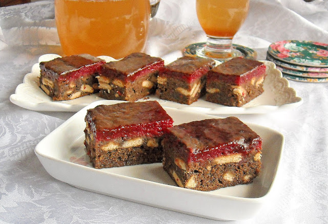 U posudu staviti džem, šećer, gaziranu vodu, sodu bikarbonu kakao i sok od limuna. Dobro umutiti mikserom, pa dodati 200 gr lomljenog keksa. Masu staviti u pleh veličine 20 x 30 cm, prethodno pouljen i posut brašnom. Peći na 180 stepeni oko 30 minuta. Pečenu toplu koru preliti sa 1 dcl mleka.